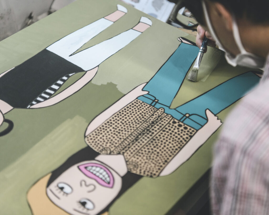 原田:茂田さんと出会ってから、PICFAでOSAJIや百貨店などのデザインの仕事を受けるようになりました。茂田さんは変態なので——これは僕の最高の褒め言葉ですが、きちんとダメ出しをしてくれるんです。企業と仕事をすると、「この部分はちょっと変更したいんですが、頑張って描いてくれたものですから今回はこれで進めましょう」といい意味で妥協する人がいます。健常者の画家やイラストレーターに依頼していたら、納得できるまで何度も描き直しをしてもらうのが普通ですが、障害者だと言いにくいのでしょう。僕らはそれをある種の優しさと受け取りますが、茂田さんの場合は、自分のイメージと違うと思えば遠慮なくズバーンと言う。それをメンバーに伝えると、彼らはうれしがったし、「もっと描ける」と喜ぶ子もいました。
