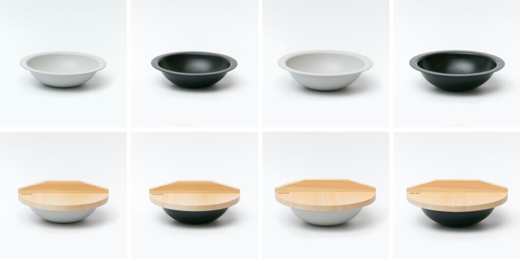 このたびのリニューアルでは、成型したアルミのコーティングをセラミック塗装に変更。からだにより安全で、炊飯器の内釜のような少量の油でも焦げ付きにくい仕様になりました。マットな質感やプリミティブなデザインもこだわり、大きさ違い、色違い、木蓋セットなど、いくつかのバリエーションを展開します。