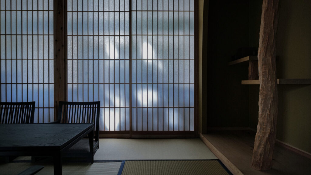 白樺荘の建物は、昭和38年に建てられた元・学習講堂。生徒たちが語り合い、学び、未来を描いてきたその空間を、安齋好太郎氏率いるADX が、土地の素材と職人の技で再生しました。名称は、あえて「しらかば荘」を継承。新しい価値を上書きするのではなく、ここに積み重なってきた時間や営みを引き受けるという想いが背景にあります。3つの客間は、視線が交わらないよう中心をずらして配置。椅子のように腰掛けられる縁側や、開閉によって空間を自在に繋ぐ障子など、滞在者の過ごし方に委ねる設計が施されています。畳・障子・襖は群馬県沼田市の職人による手仕事。違い棚は同市の指物師が手がけ、住まいが本来持っていた温もりと静けさを宿しています。