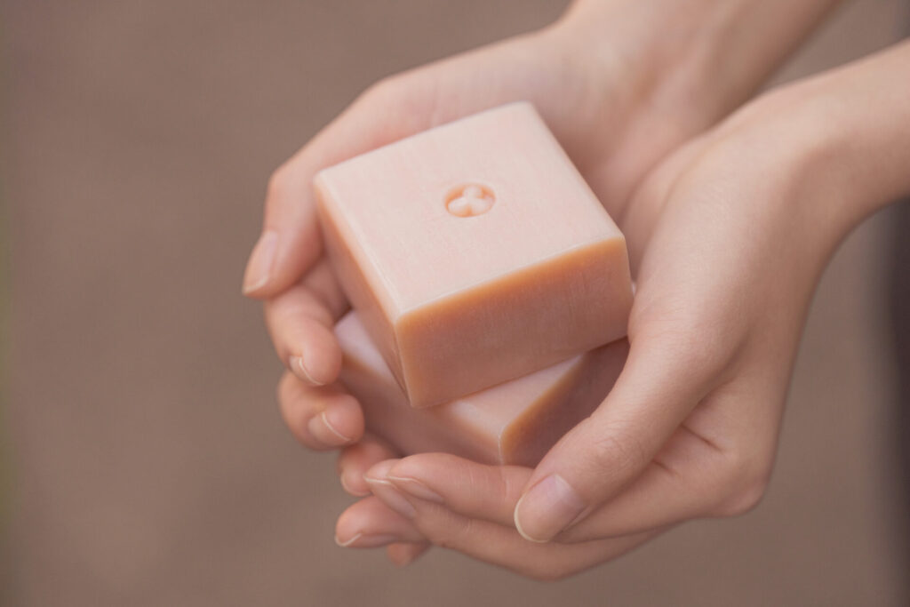 ボックスと石鹸のカラーは、繋ぎ合わせた母と子の手をイメージした温かみを感じるカラーになっています。